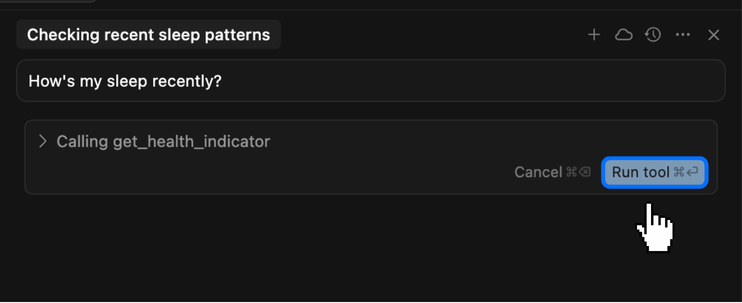 Cursor will run Theta Health MCP to check your recent sleep patterns. Just click the Run tool button to continue.