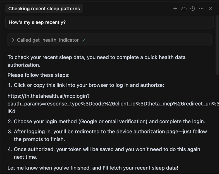 Theta Health Extension is the world’s first HIPAA-compliant health data AI MCP, available for use in Cursor, Claude Desktop, ChatGPT Business and ChatWise. It transforms your AI into a personal health expert.
